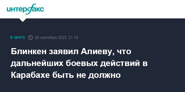 Москва. 26 сентября. INTERFAX.RU - Госсекретарь США Энтони Блинкен во вторник провел телефонный разговор с президентом Азербайджана Ильхамом Алиевым, в ходе которого они обсудили ситуацию в Нагорном Карабахе, сообщили в Госдепе.