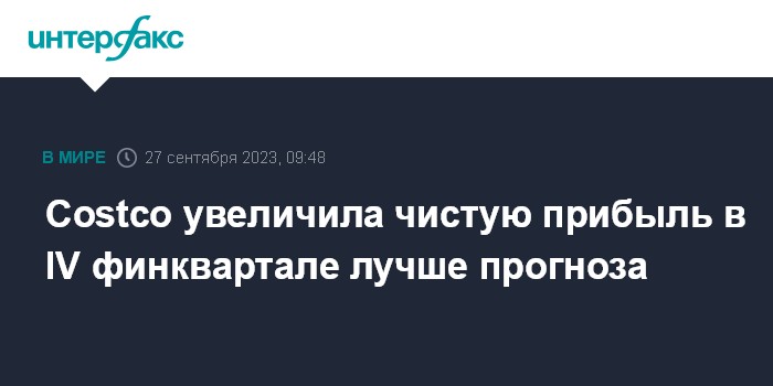Москва. 27 сентября. INTERFAX.RU - Costco Wholesale Corp., оператор крупнейшей в США сети клубных магазинов-складов, увеличил чистую прибыль в четвертом финансовом квартале на 16%, выручку – на 9,5%.