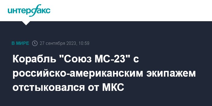Москва. 27 сентября. INTERFAX.RU - Пилотируемый корабль "Союз МС-23" с космонавтами "Роскосмоса" Сергеем Прокопьевым, Дмитрием Петелиным и астронавтом НАСА Франциско Рубио отстыковался от Международной космической станции (МКС) перед посадкой на Землю.