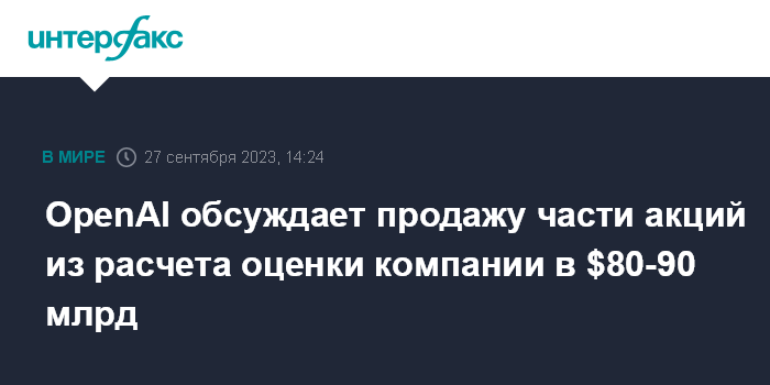 Москва. 27 сентября. INTERFAX.RU - Американский стартап OpenAI, создатель популярного чат-бота GPT, ведет переговоры с инвесторами о продаже собственных акций по цене из расчета стоимости всей компании в $80-90 млрд. Об этом пишет газета The Wall Street Journal со ссылкой на информированные источники.