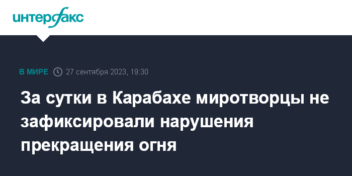 Москва. 27 сентября. INTERFAX.RU - Российский миротворческий контингент не зафиксировал нарушения режима прекращения огня в Нагорном Карабахе за прошедшие сутки, сообщили в Минобороны РФ.