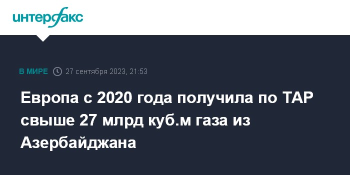Москва. 27 сентября. INTERFAX.RU - Объем азербайджанского газа, экспортированного в Европу по Транс-Адриатическому газопроводу (TAP) с декабря 2020 года, превысил 27 млрд кубометров, сообщил управляющий директор трубопроводной компании TAP AG Лука Скьеппати.