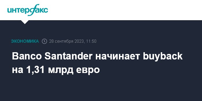 Москва. 28 сентября. INTERFAX.RU - Испанский Banco Santander начинает обратный выкуп акций на сумму до 1,31 млрд евро, говорится в сообщении банка на сайте Комиссии по ценным бумагам и биржам (SEC) США.
