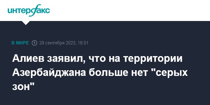 Москва. 29 сентября. INTERFAX.RU - Президент Азербайджана Ильхам Алиев заявил, что на территории страны больше нет "серых зон", положен конец сепаратизму.