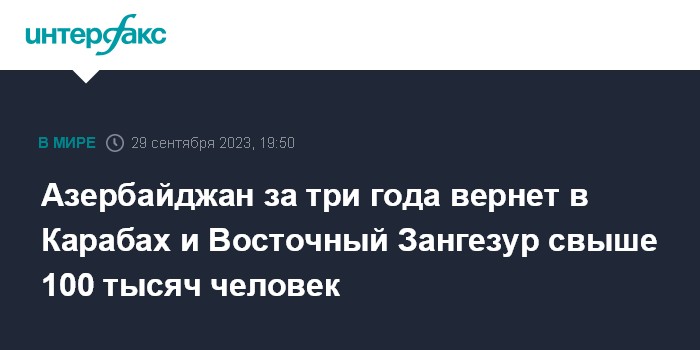 Москва. 29 сентября. INTERFAX.RU - Президент Азербайджана Ильхам Алиев заявил, что власти страны в ближайшие три года (2024-2026 годы) планируют обеспечить возвращение в Карабах и Восточный Зангезур свыше 100 тысяч человек. Он заявил об этом на втором Азербайджанском национальном градостроительном форуме в Зангилане.