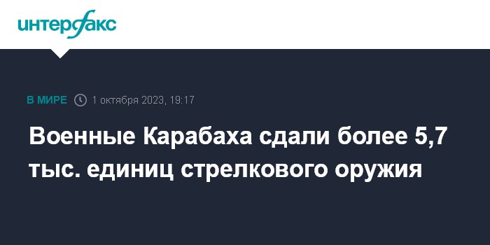 "На 1 октября сдано: 45 единиц бронетехники, 87 единиц автомобильной техники, 28 единиц средств ПВО, 63 единицы орудий полевой артиллерии, РСЗО и минометов, более 5,7 тыс. единиц стрелкового оружия и противотанковых средств, около 14 млн боеприпасов", - говорится в сообщении Минобороны РФ о деятельности российского миротворческого контингента в Нагорном Карабахе.