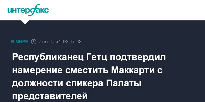 Москва. 2 октября. INTERFAX.RU - Член Палаты представителей Мэтт Гетц планирует попытаться отстранить спикера Кевина Маккарти от должности на этой неделе, сообщает CNN.