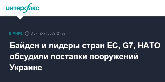 Москва. 3 октября. INTERFAX.RU - Поставки Украине боеприпасов и оружия, а также экономическая помощь Киеву стали темами разговора американского президента Джо Байдена с лидерами ЕС, стран G7 и НАТО, сообщил во вторник представитель Совета национальной безопасности США Джон Кирби.