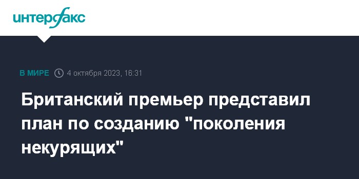 Москва. 4 октября. INTERFAX.RU - Премьер-министр Великобритании Риши Сунак объявил о плане создать в стране "покорение некурящих" за счет введения и расширения запрета на продажу сигарет молодежи, сообщает сайт правительства страны.