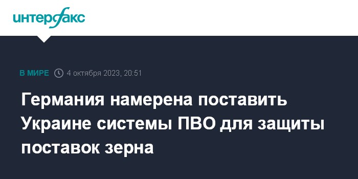 Москва. 4 октября. INTERFAX.RU - Власти ФРГ намереваются направить Украине дополнительные системы ПВО с целью защитить вывоз зерна из этой страны, сообщает в среду Bloomberg со ссылкой на источники.