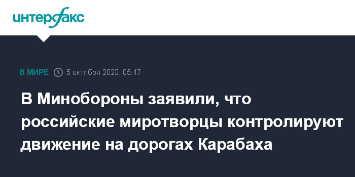 Москва. 5 октября. INTERFAX.RU - Российские миротворцы на наблюдательных постах в Нагорном Карабахе контролируют движение автомобилей на дорогах, сообщает Минобороны РФ.