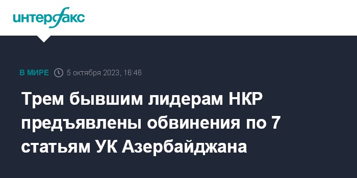 Москва. 5 октября. INTERFAX.RU - Бывшим главам лидерам непризнанной Нагорно-Карабахской Республики Аркадию Гукасяну, Бако Саакяну, бывшему спикеру парламента НКР Давиду Ишханяну предъявлены обвинения по семи статьям Уголовного кодекса Азербайджана.