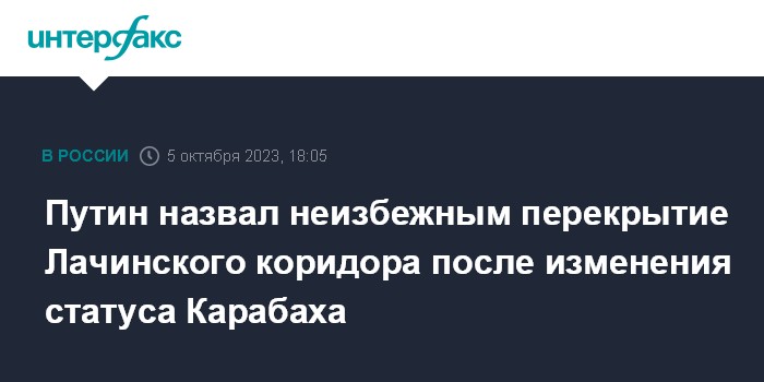 Москва. 5 октября. INTERFAX.RU - Президент России Владимир Путин заявил, что перекрытие Лачинского коридора Азербайджаном было неизбежным после изменения статуса Карабаха.