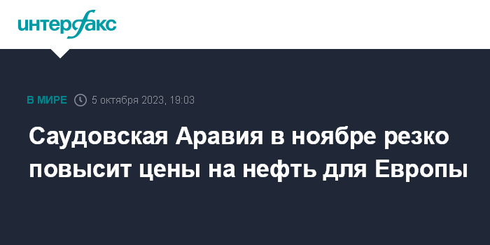 Москва. 5 октября. INTERFAX.RU - Саудовская Аравия в ноябре резко повысит цены на нефть с поставкой в европейские государства.
