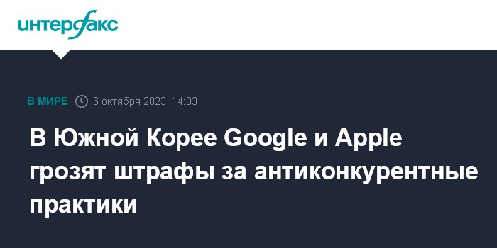 Москва. 6 октября. INTERFAX.RU - Южнокорейский регулятор телекоммуникационного сектора планирует оштрафовать Google, входящую в Alphabet Inc., а также Apple Inc. в общей сложности на $51 млн за злоупотребление рыночной позицией и нарушение местного регулирования в сфере мобильных платежей, сообщает MarketWatch.