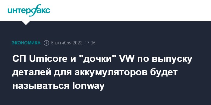 СП Umicore и "дочки" VW по выпуску деталей для аккумуляторов будет называться Ionway