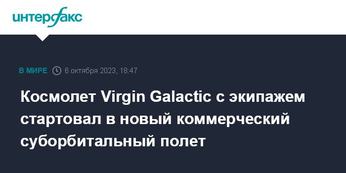 Москва. 6 октября. INTERFAX.RU - Американский пилотируемый космолет SpaceShipTwo (VSS Unity) с шестью членами экипажа в пятницу стартовал в свой четвертый коммерческий суборбитальный полет, сообщила компания-разработчик Virgin Galactic.