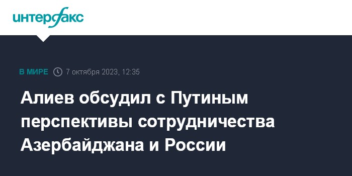Москва. 7 октября. INTERFAX.RU - Президент Азербайджана Ильхам Алиев позвонил президенту России Владимиру Путину, сообщает сайт главы азербайджанского лидера.