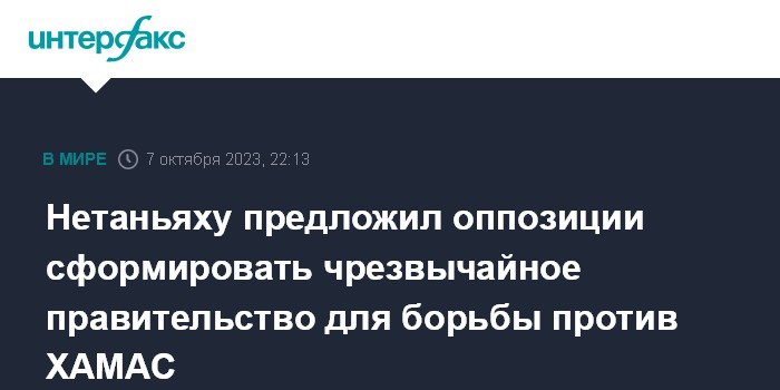 Москва. 7 октября. INTERFAX.RU - Премьер-министр Израиля Биньямин Нетаньяху предложил лидерам оппозиции Яиру Лапиду и Бенни Ганцу сформировать чрезвычайное правительство на фоне масштабной атаки ХАМАС на страну, сообщает в субботу вечером газета Times of Israel.
