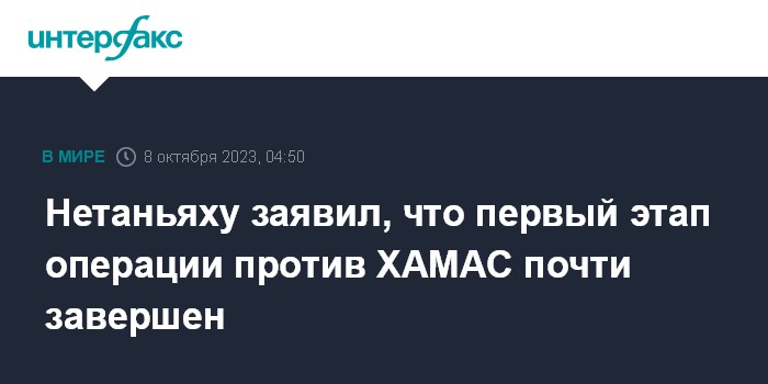 Москва. 8 октября. INTERFAX.RU - Премьер-министр Израиля Биньямин Нетаньяху заявил, что первый этап операции против ХАМАС в секторе Газа близится к завершению, сообщают израильские СМИ.