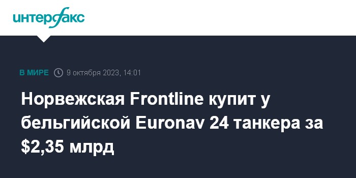 Москва. 9 октября. INTERFAX.RU - Норвежская Frontline покупает 24 танкера класса VLCC (сверхкрупные танкеры) у бельгийской Euronav за $2,35 млрд.