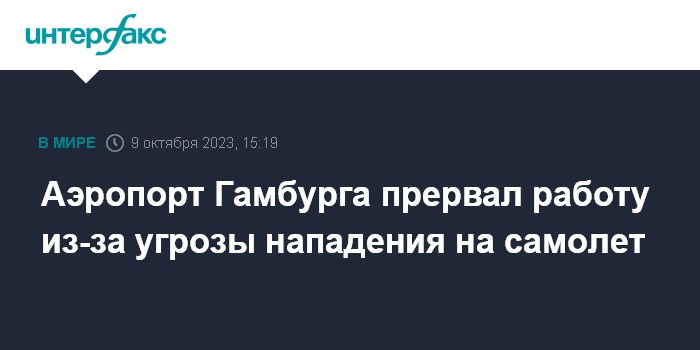 Москва. 9 октября. INTERFAX.RU - Аэропорт Гамбурга с 12:40 (13:40 по Москве) не принимает и не отправляет рейсы из-за поступившей угрозы нападения на самолет, прибывший из Ирана, сообщает АР со ссылкой на dpa и представителей федеральной полиции Германии.
