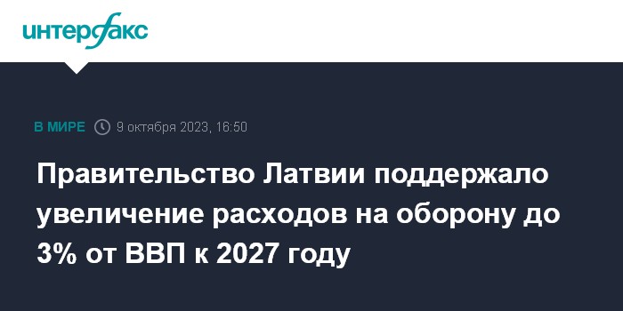 Москва. 9 октября. INTERFAX.RU - Правительство Латвии на внеочередном заседании одобрило поправки к закону о финансировании обороны, которые предусматривают его постепенное увеличение до 3% от ВВП к 2027 году.