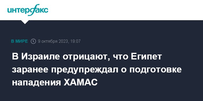 Москва. 9 октября. INTERFAX.RU - В канцелярии премьера Израиля Биньямина Нетаньяху назвали несоответствующими действительности сообщения СМИ о том, что власти Египта якобы заранее предупреждали о подготовке палестинским движением ХАМАС масштабной атаки.