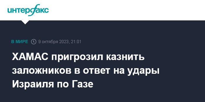 Москва. 9 октября. INTERFAX.RU - Радикальное движение ХАМАС пригрозило казнить заложников из Израиля в случае нанесения армией Израиля ударов без предупреждения по Газе, сообщает Associated Press.