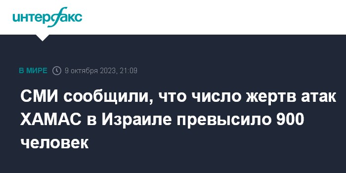 Москва. 9 октября. INTERFAX.RU - Более 900 человек погибли в результате атак ХАМАС по Израилю, более 2,6 тыс. получили ранения. Об этом сообщают в понедельник израильские СМИ.