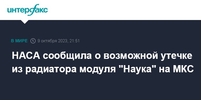 Москва. 9 октября. INTERFAX.RU - Специалисты американского Центра управления полетами сообщили о возможной утечке из модуля "Наука" российского сегмента Международной космической станции (МКС).