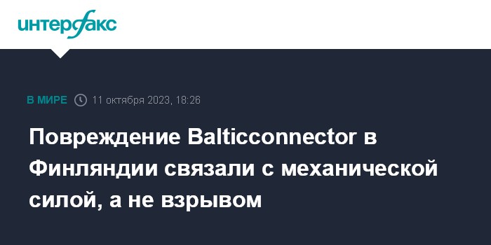 Москва. 11 октября. INTERFAX.RU - Повреждение газопровода Balticconnector между Эстонией и Финляндией было вызвано механической силой, а не взрывом, заявил глава Национального бюро расследований Финляндии (НБР) Робин Ларго.