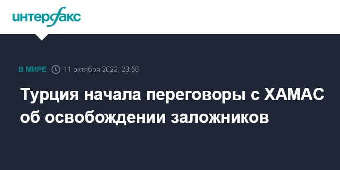 Москва. 11 октября. INTERFAX.RU - Власти Турции проводят переговоры с палестинской группировкой ХАМАС по поводу освобождения удерживаемых в секторе Газа заложников, сообщает в среду "Аль-Джазира" со ссылкой на турецкие официальные лица.