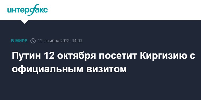 Москва. 12 октября. INTERFAX.RU - Президент России Владимир Путин посетит Киргизию 12 октября с официальным визитом, в ходе которого проведет переговоры со своим киргизским коллегой Садыром Жапаровым, а также примет участие в торжественном мероприятии по случаю двадцатилетия российской авиабазы в Канте.