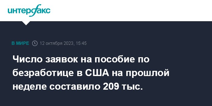 Москва. 12 октября. INTERFAX.RU - Число американцев, впервые обратившихся за пособием по безработице, на прошлой неделе составило 209 тыс., говорится в отчете министерства труда США.