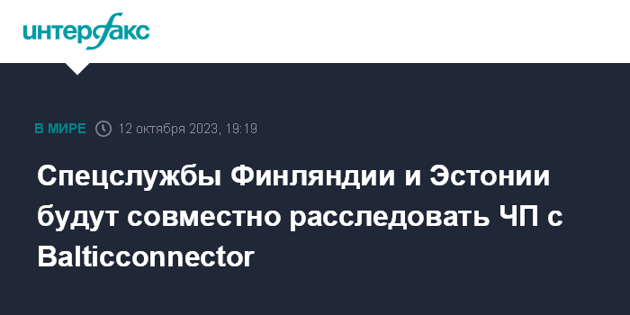 Москва. 12 октября. INTERFAX.RU - Национальное бюро расследований (НБР) Финляндии сообщило, что создаст совместную с эстонскими коллегами следственную группу для предварительного расследования обстоятельств инцидента с газопроводом Balticconnector.
