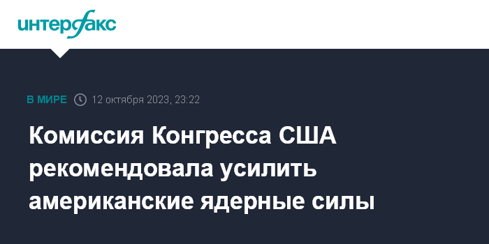 Москва. 12 октября. INTERFAX.RU - Комиссия Конгресса США по политике в области стратегических сил выступила с рекомендациями по наращиванию американского ядерного потенциала, следует из опубликованного в четверг доклада.