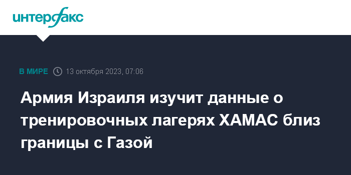 Москва. 13 октября. INTERFAX.RU - Израильские военные заявили, что проведут расследование в связи с тренировочными лагерями ХАМАС, обнаруженными вблизи границы с Газой, сообщает телеканал CNN.