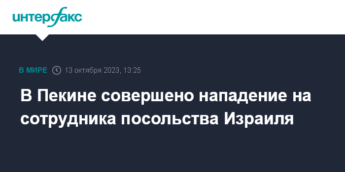 Москва. 13 октября. INTERFAX.RU - МИД Израиля сообщил, что в Пекине при невыясненных обстоятельствах было совершено нападение на сотрудника израильского посольства, ему потребовалась госпитализация, передает АР.