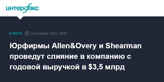 Москва. 13 октября. INTERFAX.RU - Партнеры юридических фирм Allen & Overy и Shearman & Sterling подавляющим большинством голосов одобрили их слияние в компанию, годовая выручка которой предварительно оценивается в $3,5 млрд, сообщает Financial Times.