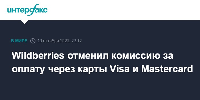 Москва. 11 октября. INTERFAX.RU - Маркетплейс Wildberries отменил комиссии при оплате товаров картами Visa и Mastercard, сообщила компания. Решение принято по итогам совещания в Генпрокуратуре с представителями Wildberries, Банка России и Роспотребнадзора 12 октября.