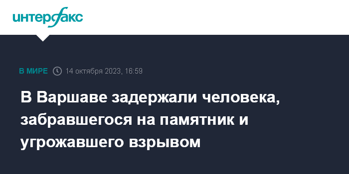 Москва. 14 октября. INTERFAX.RU - Полицейские в Варшаве задержали мужчину, который забрался на памятник на площади Пилсудского и угрожал взрывом, сообщает Associated Press.