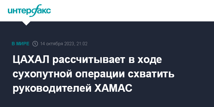Москва. 14 октября. INTERFAX.RU - Израильская армия в ходе готовящейся масштабной наземной операции в секторе Газа рассчитывает продвинуться вглубь анклава и схватить руководителей ХАМАС, сообщает в субботу "Гаарец".