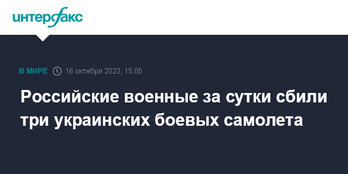Москва. 16 октября. INTERFAX.RU - Сбиты два истребителя Миг-29 и один штурмовик Су-25 воздушных сил Украины, сообщили в Минобороны РФ.