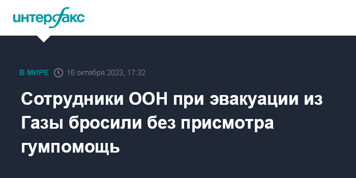 Москва. 16 октября. INTERFAX.RU - Работники ООН во время эвакуации из сектора Газа оставили на месте гуманитарную помощь, которая попала к людям, связанным с группировкой ХАМАС, сообщает "Гаарец".
