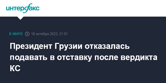 Москва. 16 октября. INTERFAX.RU - Президент Грузии Саломе Зурабишвили не намерена подавать отставку после вынесенного в понедельник решения Конституционного суда о нарушении ею Конституции страны.