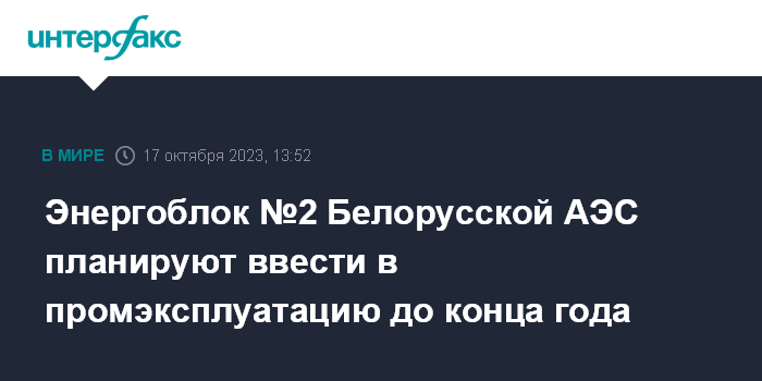 Москва. 17 октября. INTERFAX.RU - Второй энергоблок Белорусской АЭС (БелАЭС) планируется ввести в промышленную эксплуатацию до конца текущего года после завершения работы приемочной комиссии, сообщил министр энергетики Белоруссии Виктор Каранкевич.