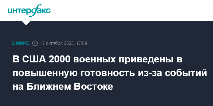 Москва. 17 октября. INTERFAX.RU - Глава Пентагона Ллойд Остин распорядился привести около 2 тысяч военнослужащих в состояние повышенной боевой готовности для их возможной отправки к новому месту назначения в связи с событиями на Ближнем Востоке.