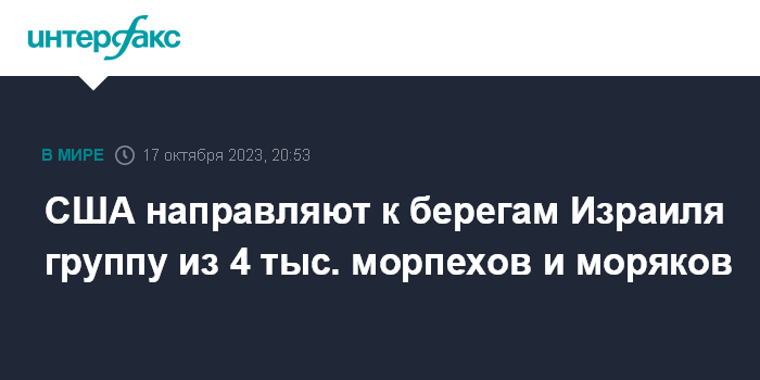 Москва. 17 октября. INTERFAX.RU - США отправили к побережью Израиля амфибийно-десантную группу в составе 4 тыс. морских пехотинцев и моряков на трех кораблях, сообщает The Washington Post со ссылкой на источники в Пентагоне.
