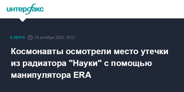 Москва. 18 октября. INTERFAX.RU - Российский экипаж Международной космической станции (МКС) провел осмотр места утечки теплоносителя из резервного контура радиатора модуля "Наука" с помощью европейской роботизированной руки-манипулятора ERA, сообщили в "Роскосмосе" в среду.